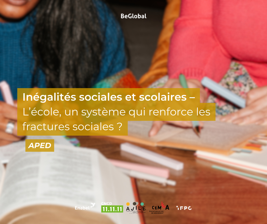 Le 11 avril 2025 à Namur, rejoignez des enseignant·es du primaire et du secondaire, de l’enseignement ordinaire et spécialisé, pour une journée de réflexion et d’échanges. Organisée par BeGlobal, AJILE asbl, les CÉMÉA et le CNCD-11.11.11, cette journée vous invite à interroger les inégalités qui traversent l’école et à explorer des pistes pour des pratiques pédagogiques transformatrices.