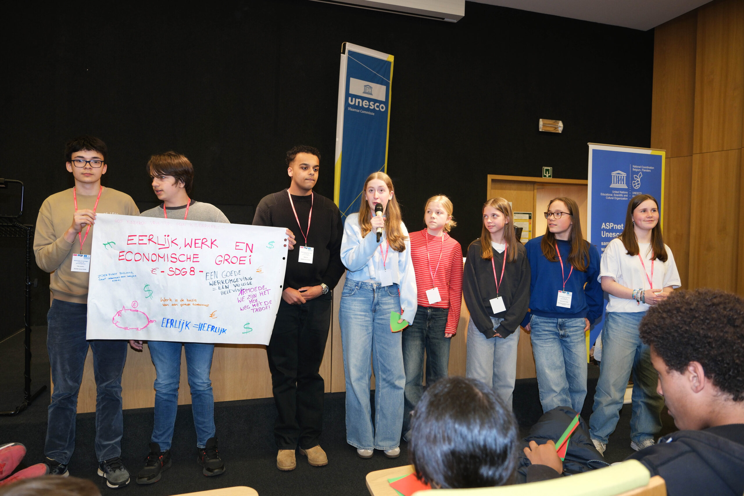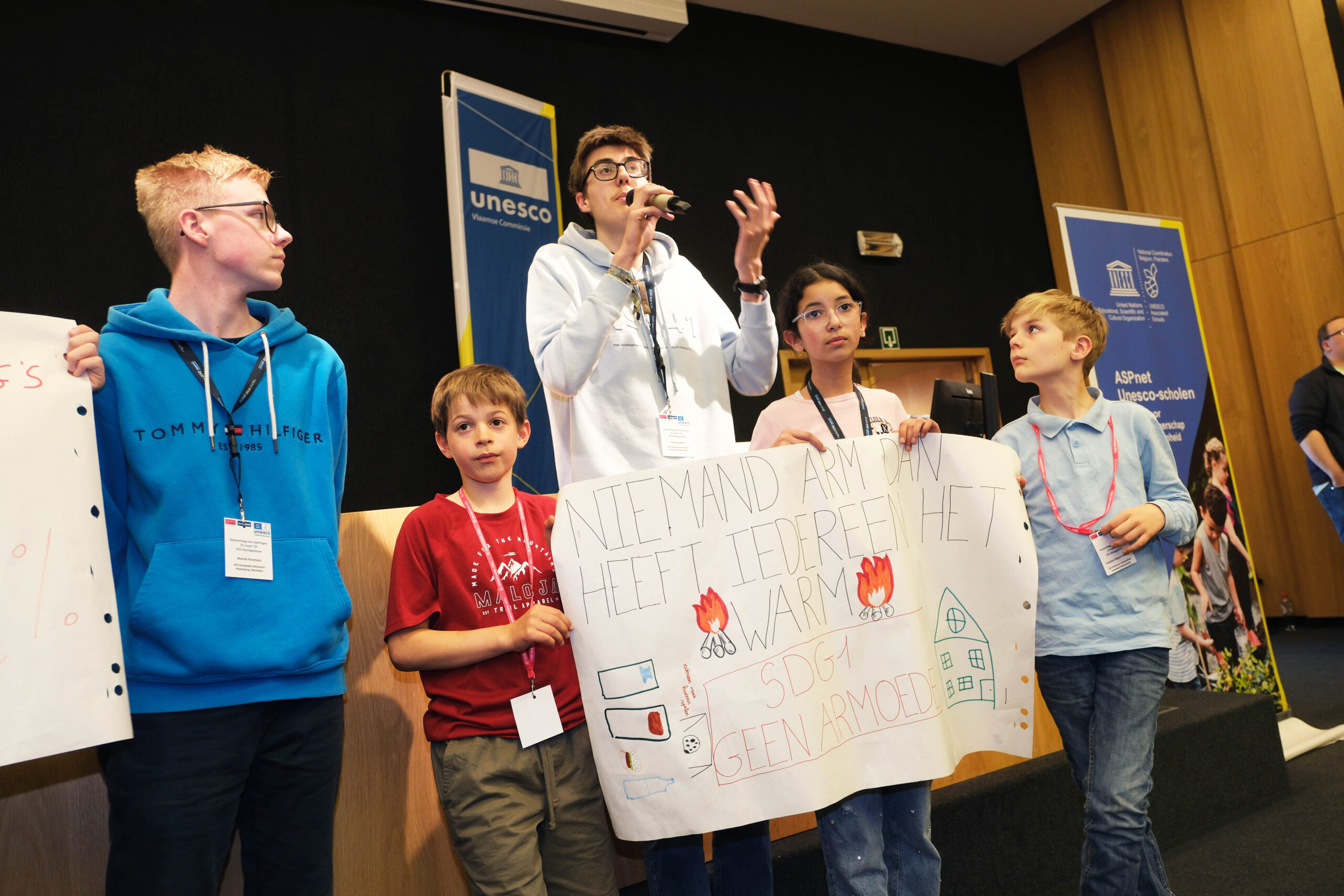 Jong en oud brainstormden nadien over de selectie van de Duurzame Ontwikkelingsdoelstellingen waar de UNESCO scholen volgend schooljaar op zullen werken. Deze inspirerende dag werd afgesloten met een presentatie van de gekozen SDG’s voor 2025-2026 en een stemming. SDG1: Beëindig armoede overal en in al haar vormen, werd het gekozen thema voor het nieuwe werkingsjaar van de Vlaamse UNESCO-scholen.