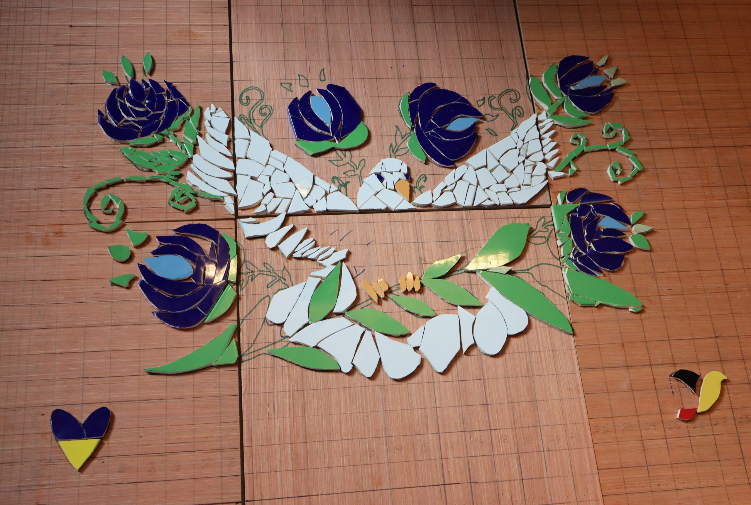 Wat maakt dit werk zo speciaal? Ten eerste is het ontwerp gebaseerd op het originele werk van Karina Chizhenko, een 16-jarige studente uit Kiev. De bloemelementen symboliseren de unieke decoratieve Petrykivkastijl van Oekraïne. Die stijl werd in 2013 opgenomen in de lijst van immaterieel cultureel erfgoed van UNESCO. De fragmenten die gebruikt werden voor het werk, komen onder andere van tegels van gebouwen in Oekraïne die beschadigd zijn door de oorlog. Daardoor draagt het kunstwerk een krachtige boodschap uit: zelfs uit de ruïnes van de vernietiging kan iets nieuws en zinvols worden gecreëerd.